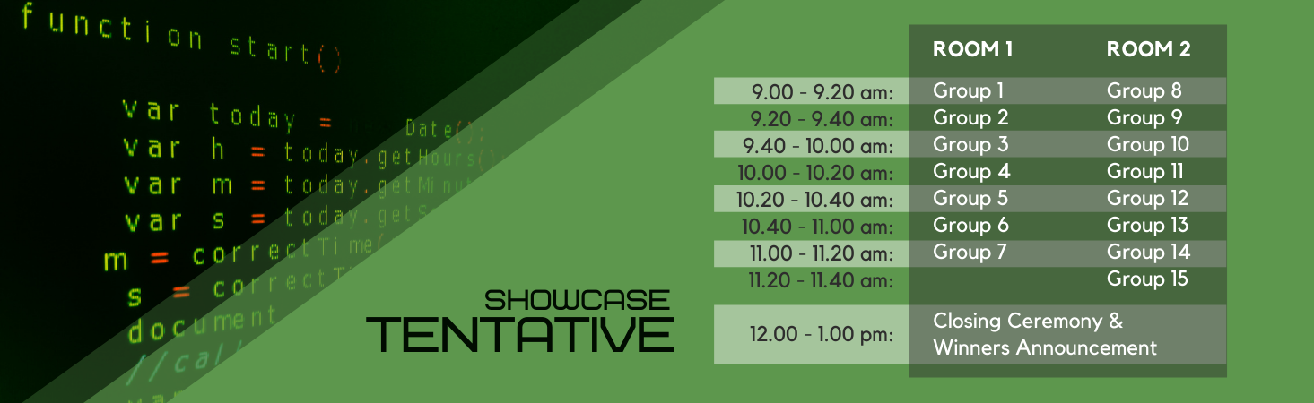 Presentation Rooms Closing ceremony and winners announcement Presentation for group 1-7 Presentation for group 8-15 Virtual Booths Simply click the box of your choice below to visit the group’s virtual booth.