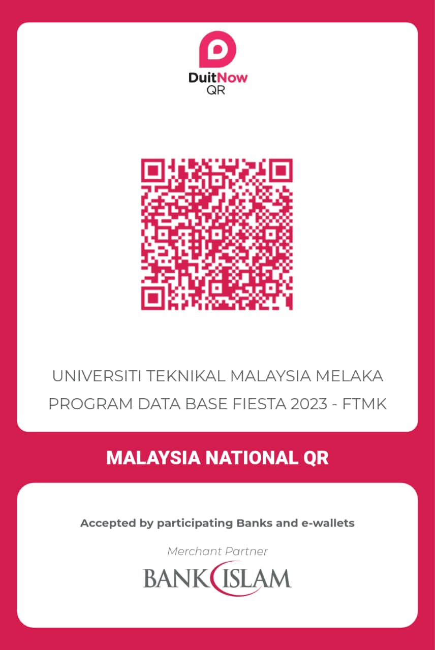 | Payment | ![]() SCAN QR CODE TO PAY Nama Akaun : Universiti Teknikal Malaysia Melaka No. Akaun : 04042010000833 Nama Bank : Bank Islam Malaysia Berhad Nama Cawangan : Cawangan Ayer Keroh, Melaka (Code: 116) Alamat Cawangan : No. 1 & 3, Jalan KF4, Kota Fesyen - MITC, Hang Tuah Jaya, 75450 Ayer Keroh, Melaka Swift Code : BIMBMYKL Rujukan : DBFiesta2023(Participant) Please bring the payment receipt on the day of registration/competition |