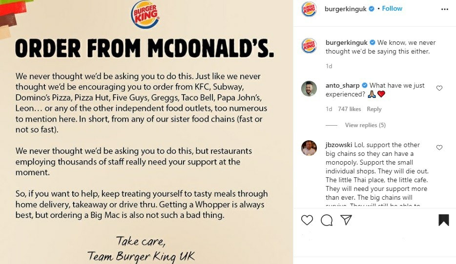 Burger King UK dan rakan-rakannya perniagaan membuktikannya, dengan sama-sama mempromosikan perniagaan dan usaha pesaing-pesaing mereka, tanpa risau sedikitpun keuntungan mereka akan berpindah ke kantung pesaing-pesaing mereka. Dan usaha mereka ini mendapat perhatian dan menyentuh hati seluruh dunia, ya seluruh dunia yang mengetahui akan perkara ini.