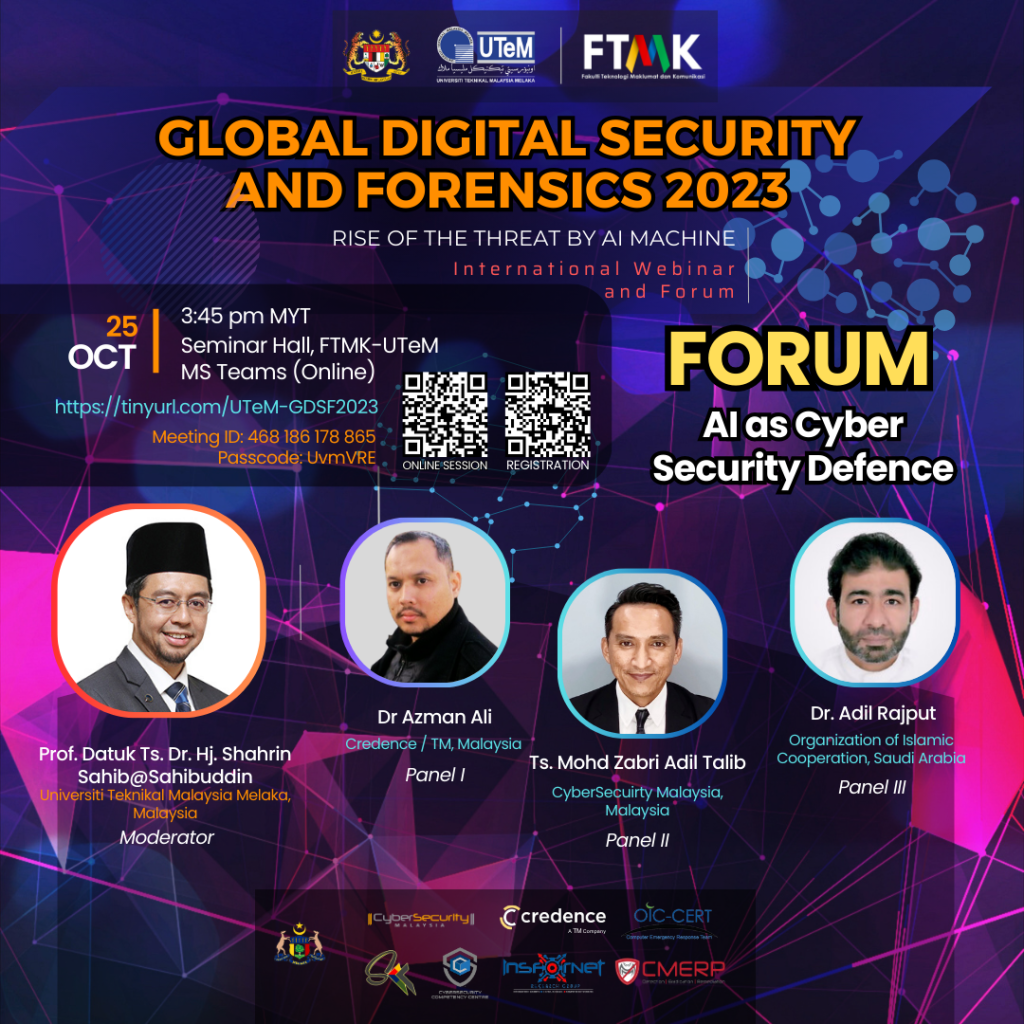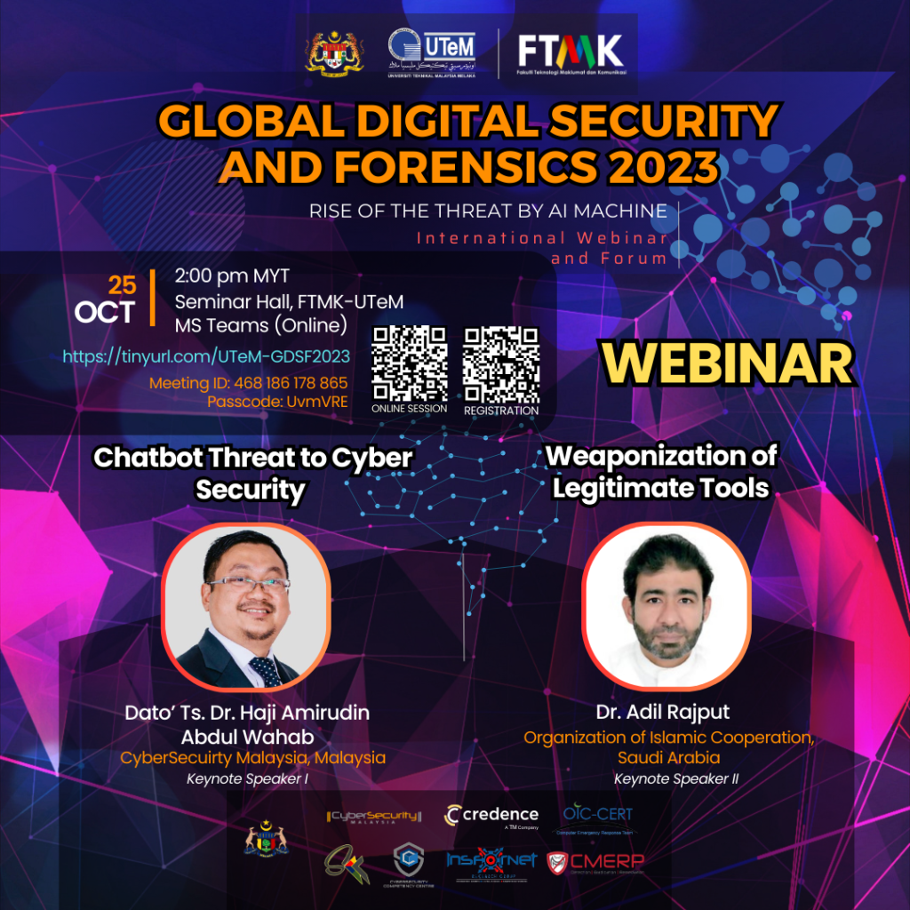 GLOBAL DIGITAL SECURITY AND FORENSICS (GDSF 2023) an International Webinar with the theme “Rise of The Threat by AI Machine” aims to foster global cyber security and digital forensics with respect to future trends through international cooperation among collaborators. The event itself provides unique sessions focusing on digital forensics and cyber security current issues and challenges addressed in two Keynote sessions entitled “Chatbot Threat to Cyber Security” and Weaponization of legitimate tools”; and a Panel discussion which look into opportunities to exchange ideas and experience, diverse expertise, and organisation working on the “AI as Cyber Security Defence”.