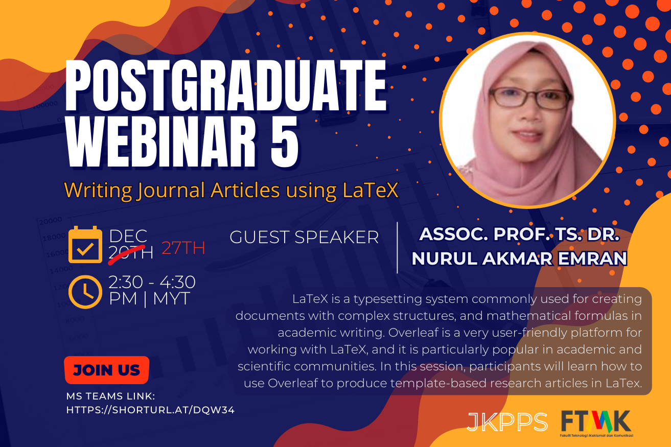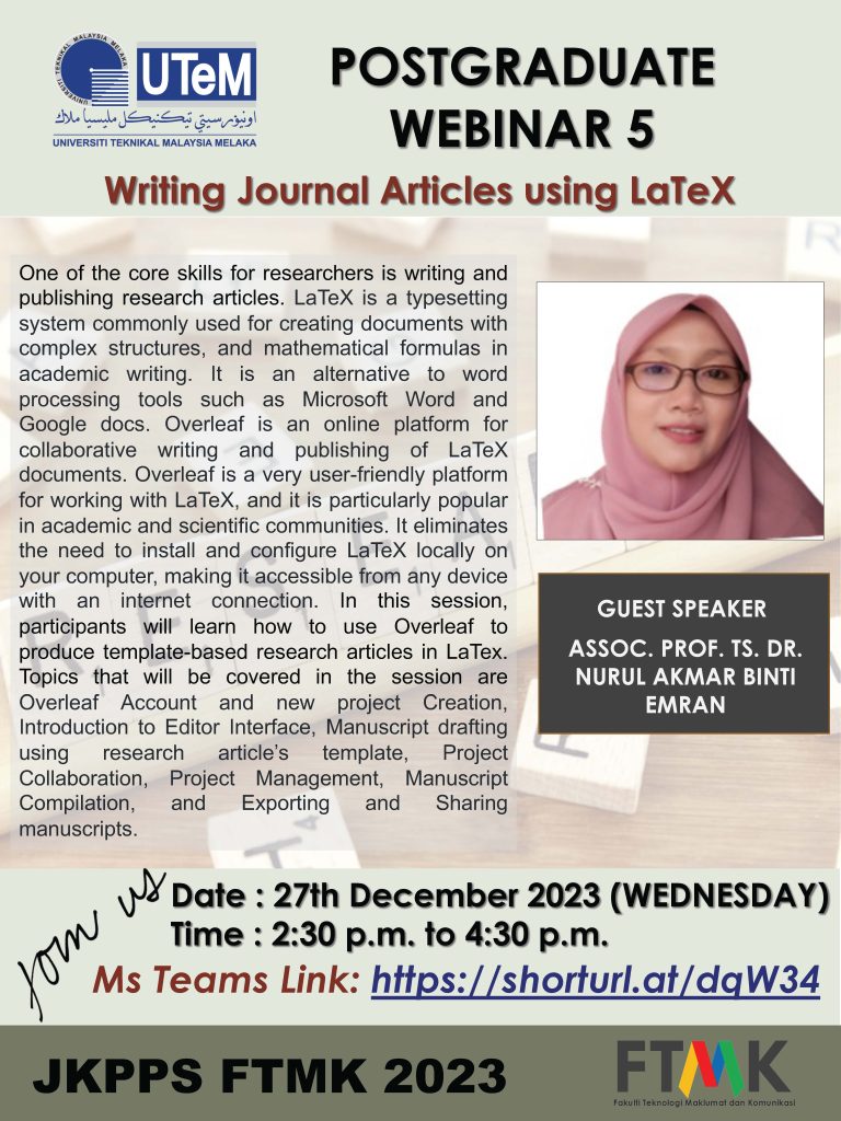 Please be informed that a Postgraduate webinar 5 on “Writing Journal Articles Using Latex” organized by JK PPS FTMK 2023 will be held as follows: