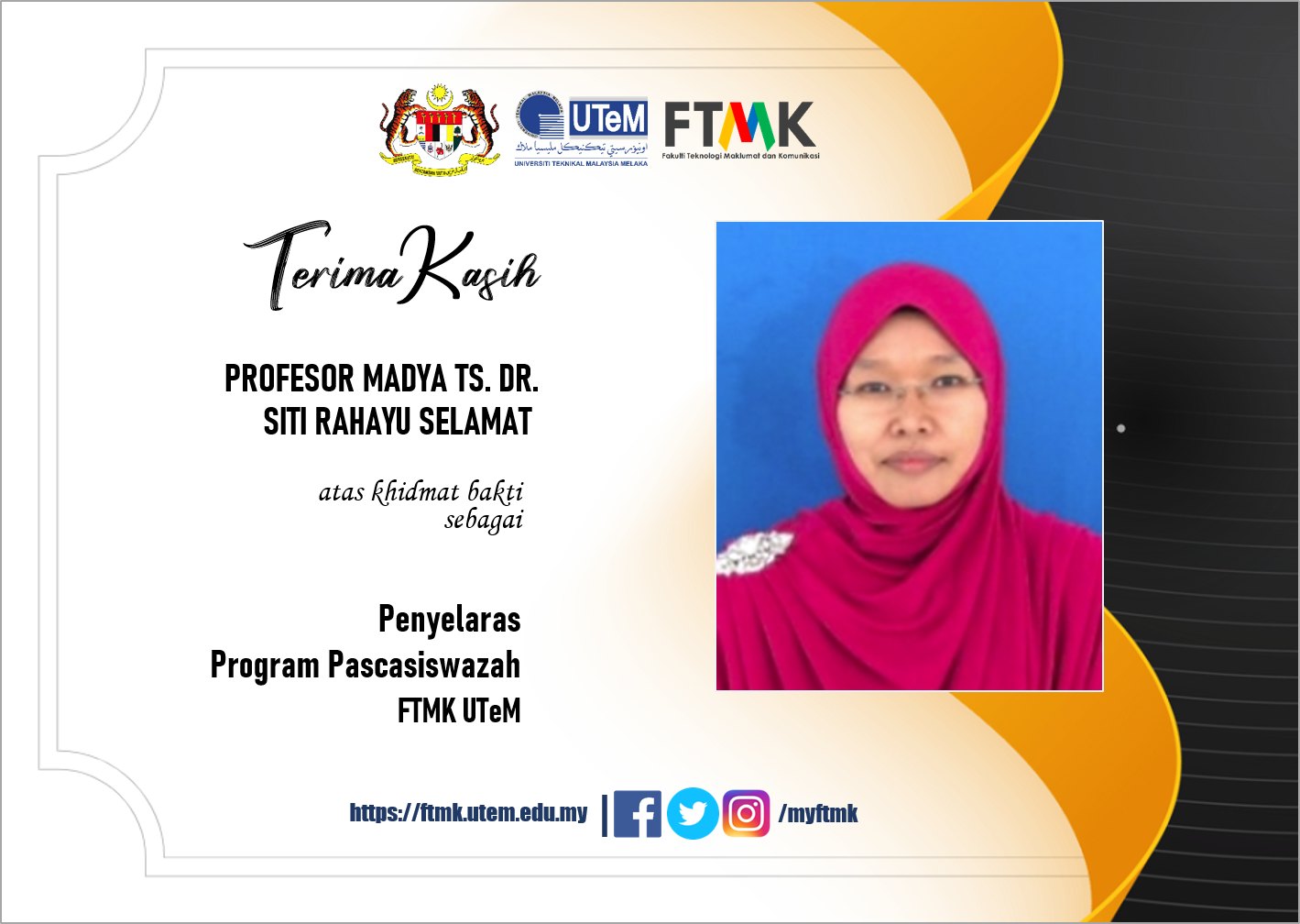 Kalungan penghargaan dan ucapan terima kasih dirakamkan buat Profesor Madya Ts. Dr. Siti Rahayu Selamat atas khidmat selaku Penyelaras Program Pasca Siswazah FTMK UTeM sehingga 30 Jun 2023.