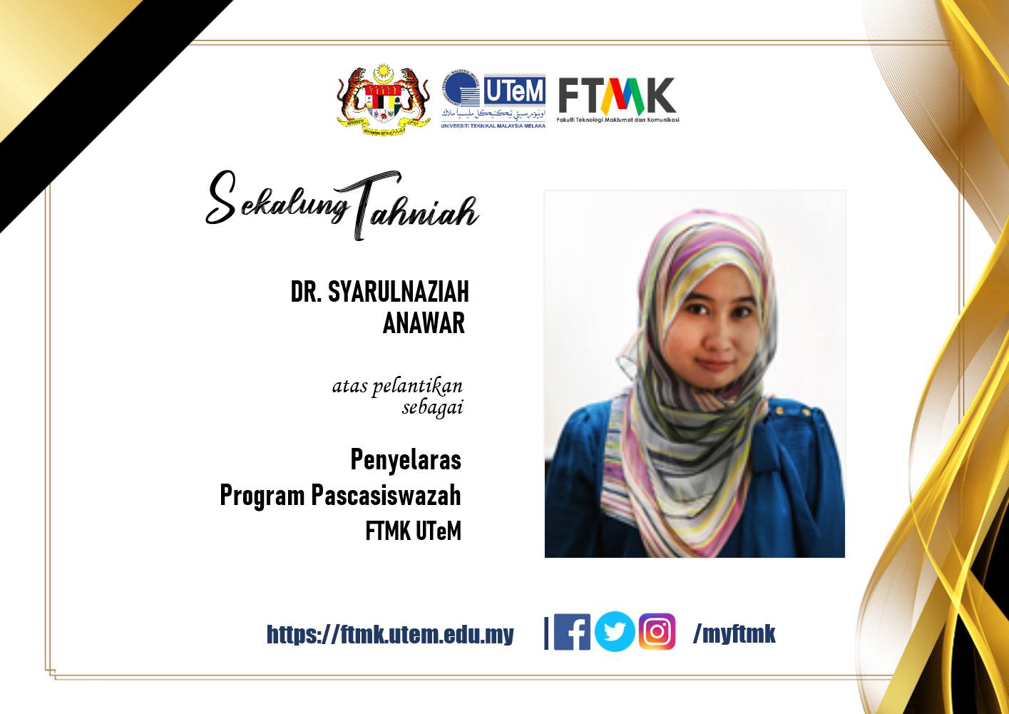 ð—¦ð—²ð—¸ð—®ð—¹ð˜‚ð—»ð—´ ð—§ð—®ð—µð—»ð—¶ð—®ð—µ Kalungan penghargaan dan ucapan terima kasih dirakamkan buat Profesor Madya Ts. Dr. Siti Rahayu Selamat atas khidmat selaku Penyelaras Program Pasca Siswazah FTMK UTeM sehingga 30 Jun 2023. Fakulti Teknologi Maklumat dan Komunikasi UTeM juga merakamkan ucapan Sekalung Tahniah buat Dr. Syarulnaziah Anawar atas pelantikan selaku Penyelaras Program Pasca Siswazah FTMK UTeM yang […]